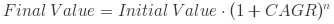 CAGR = (Ending Value / Beginning Value) ^ (1 / Number of Years) - 1